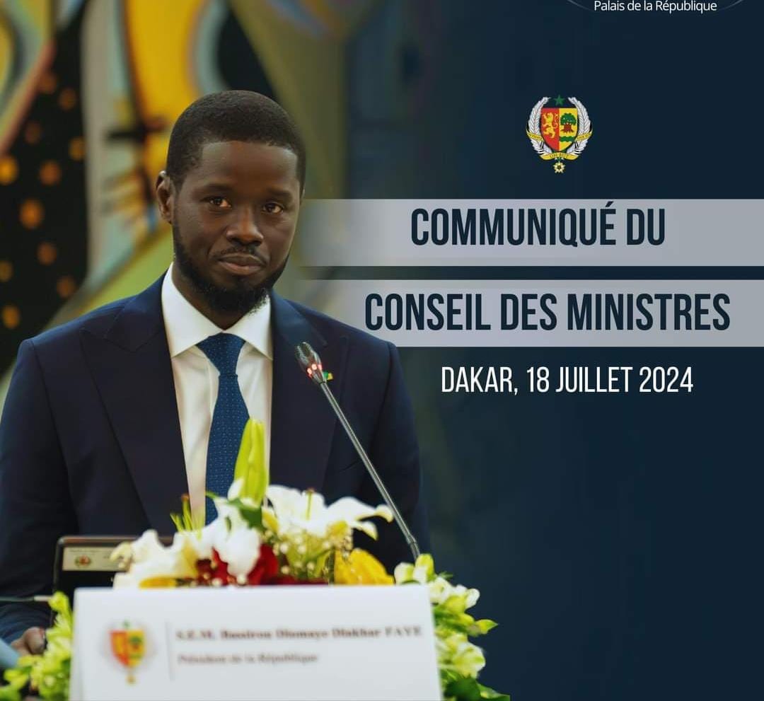 COMMUNIQUE DU CONSEIL DES MINISTRES DU JEUDI 18 MAI 2024. Le Chef de l’Etat, Son Excellence Monsieur Bassirou Diomaye Diakhar FAYE a présidé, ce jeudi 18 juillet 2024, la réunion hebdomadaire du Conseil des Ministres, au Palais de la République.