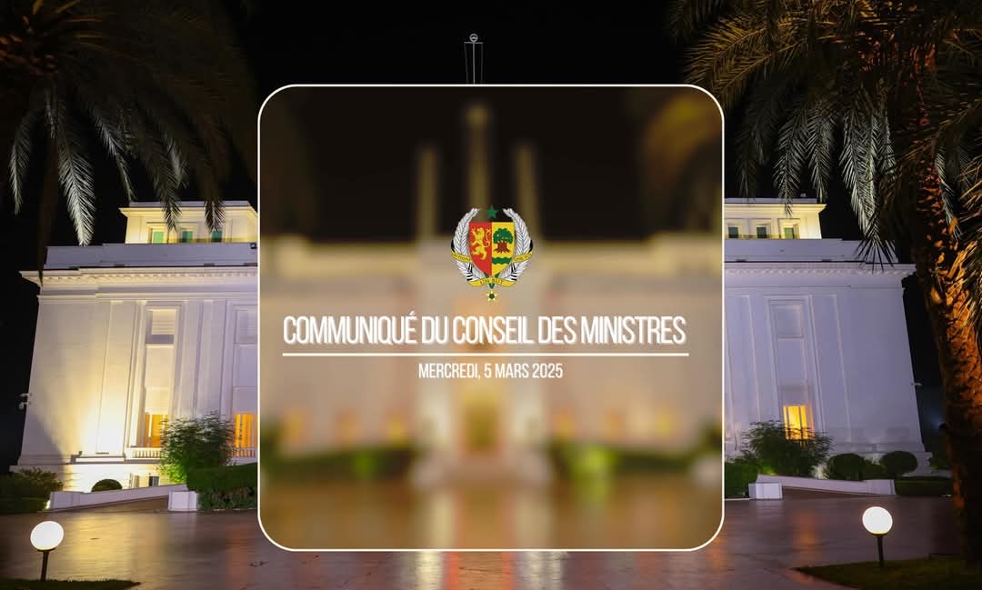 COMMUNIQUE DU CONSEIL DES MINISTRES DU MERCREDI 05 MARS 2025 . Le Chef de l’Etat, Son Excellence, Monsieur Bassirou Diomaye Diakhar FAYE a présidé, ce mercredi 05 mars 2025, la réunion hebdomadaire du Conseil des Ministres, au Palais de la République.